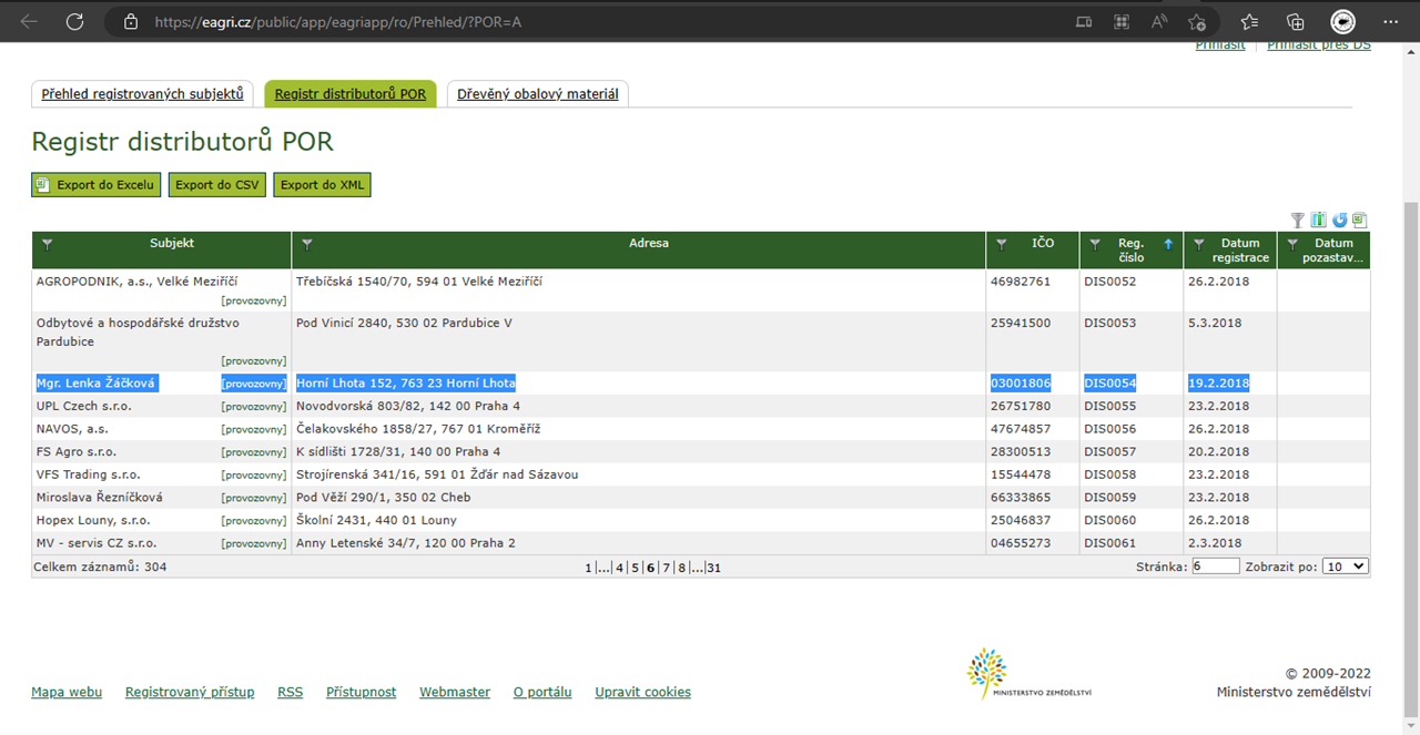 Evidence v registru distributorů POR pro profesionální uživatele ÚKZÚZ.