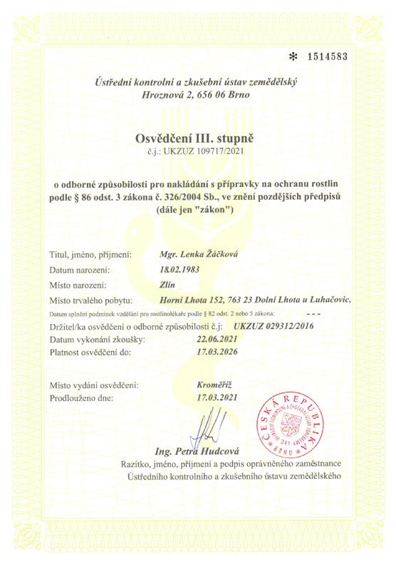 Osvědčení o odborné způsobilosti pro nakládání s přípravky na ochranu rostlin III. stupně č. 1514583,